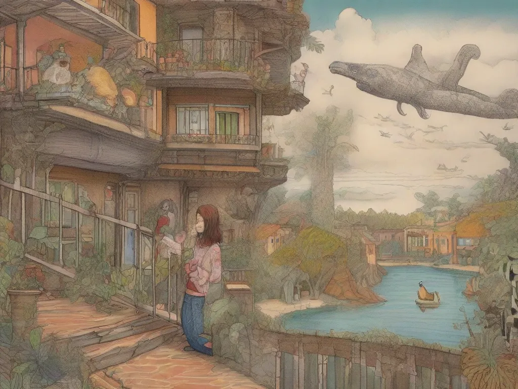 A human stands at a balcony they are considering wheather of not to jump the world below them is the interior of a toy house with animal citezens they have a hammerhead cat