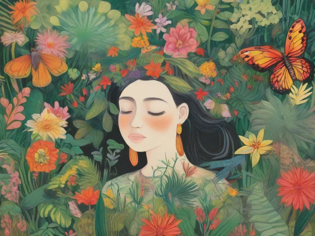 A girl crying surrounded by beautiful plants an animals