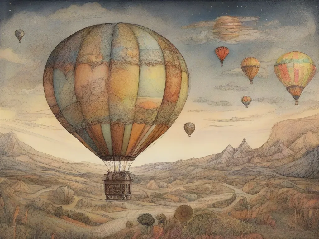 Me imagino volando en un globo aerostático viajando hacia la luna y viendo con un telescopio la tierra muy lejana, todo en tonos muy coloridos y alegres