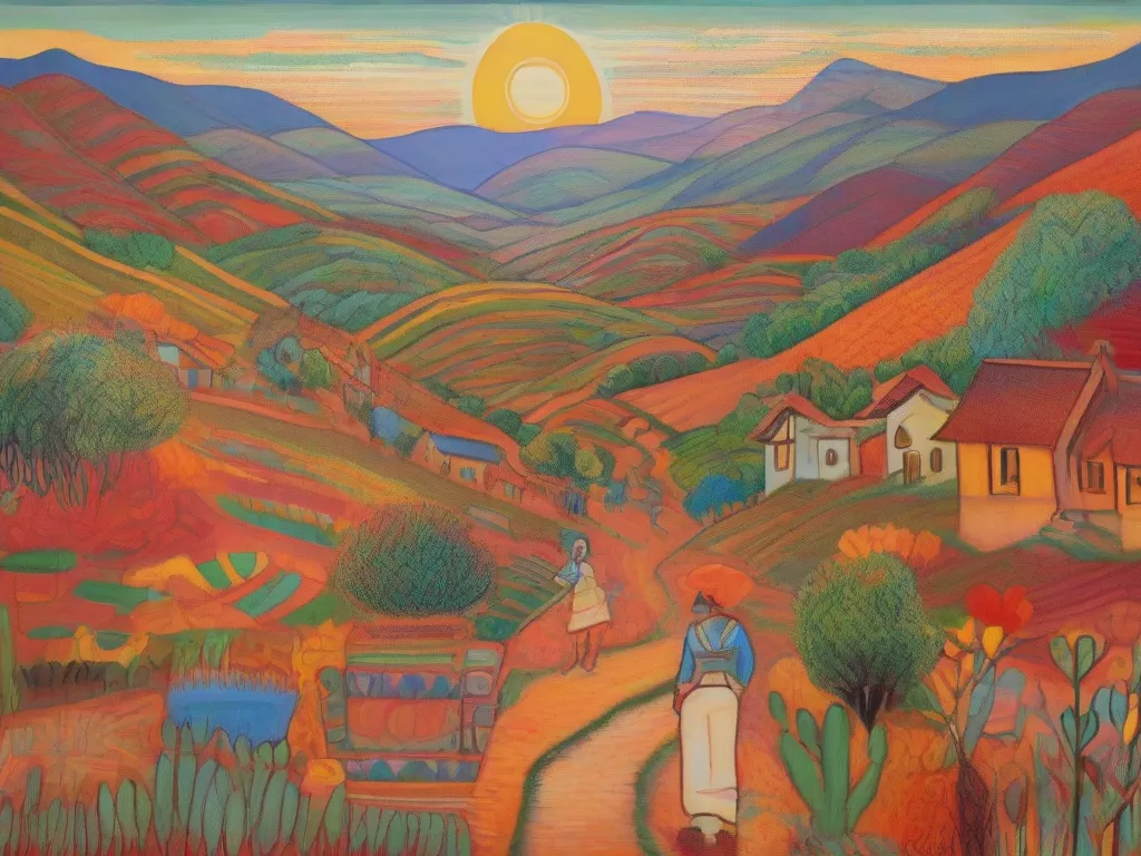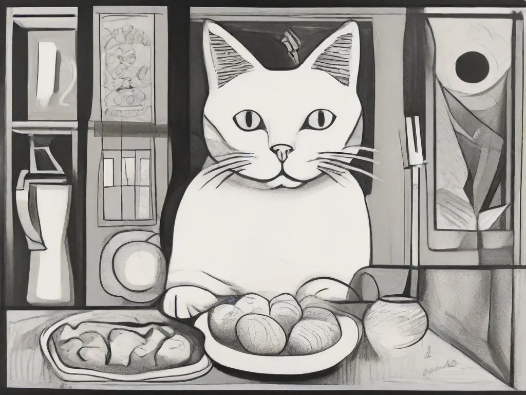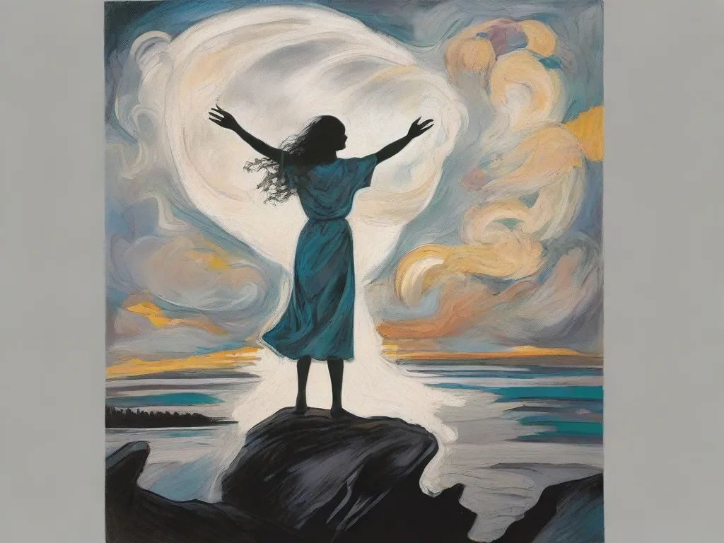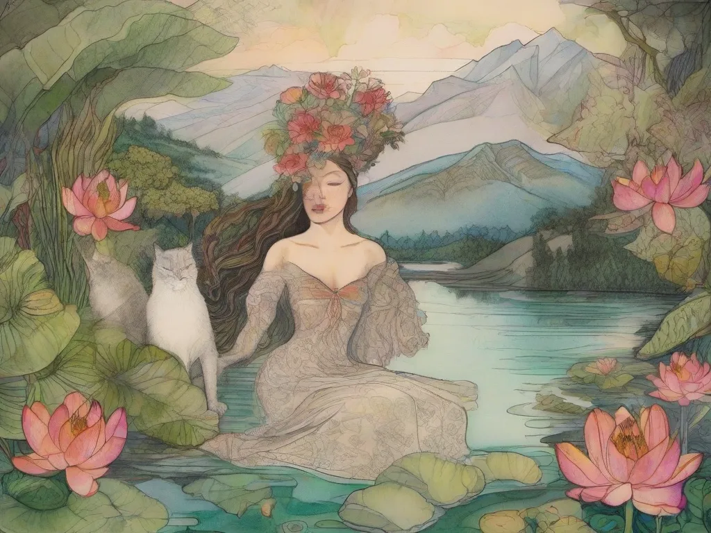 A woman with a cat head singing on the beautfiul lake coast with mountain mount Everest in the background.