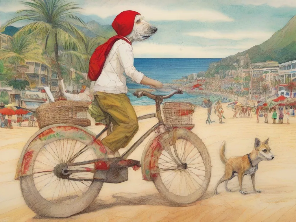 A blonde boy, who is in a dog body riding on a bike on the ipanema beach in rio de Janeiro Brasil. He is wearing a red cap