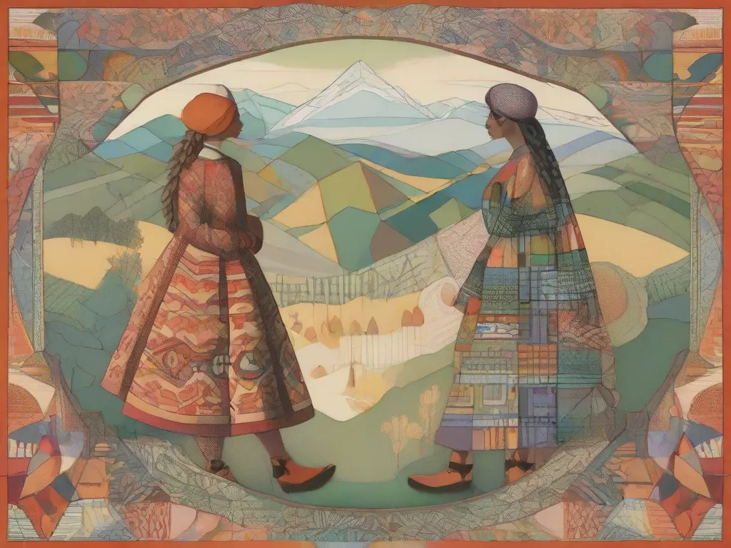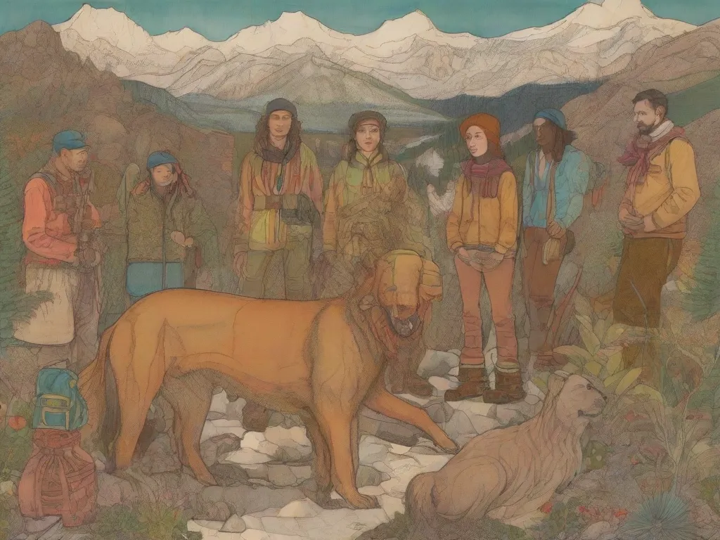 2 women with hiking clothes in the mountains with a group of men an d women and a brown dog