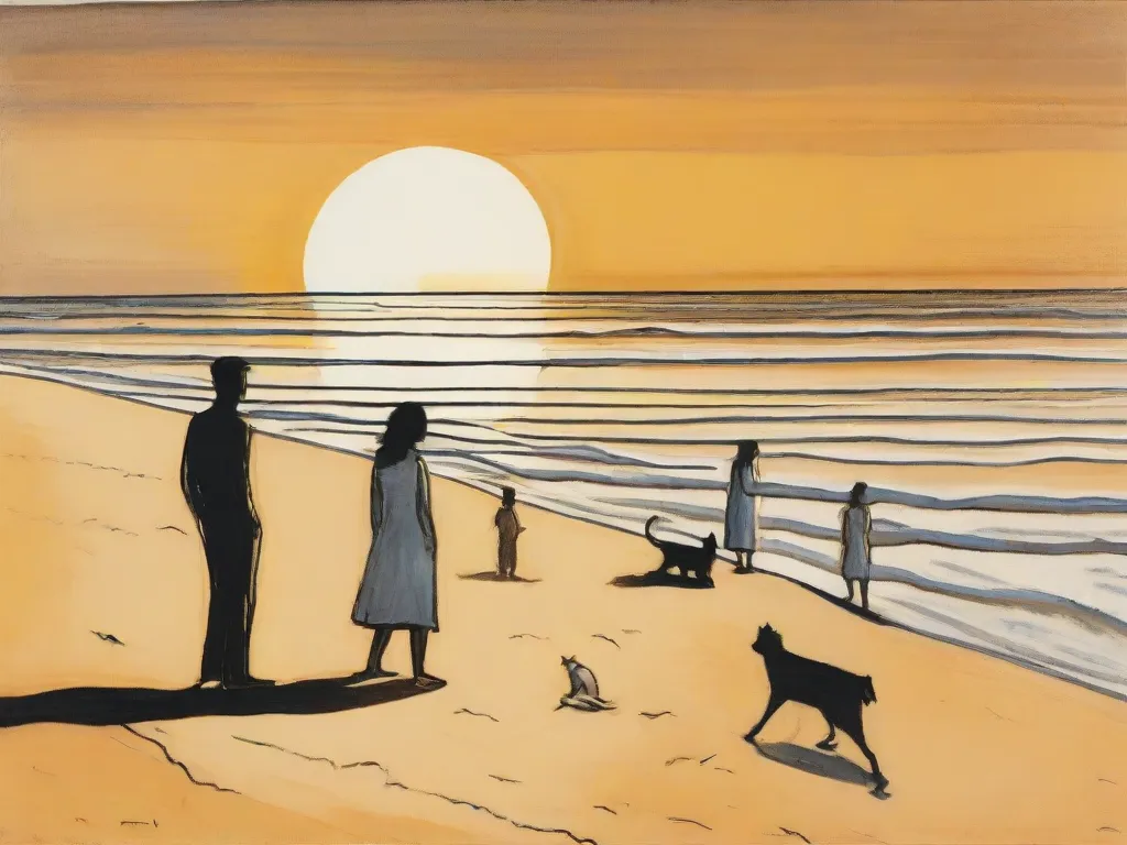 Sitting by an Australian beach with my parents, sisters, boyfriend, black and white cat and brown dog, staring at the sunset on the horizon. Focus on the water, the people, and the crisp yellow sand. 6 people in total
