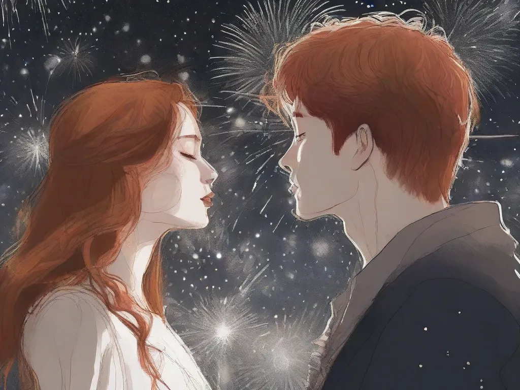 First kiss with a brown hair boy girl with red hair, alcohol, new years eve and firework