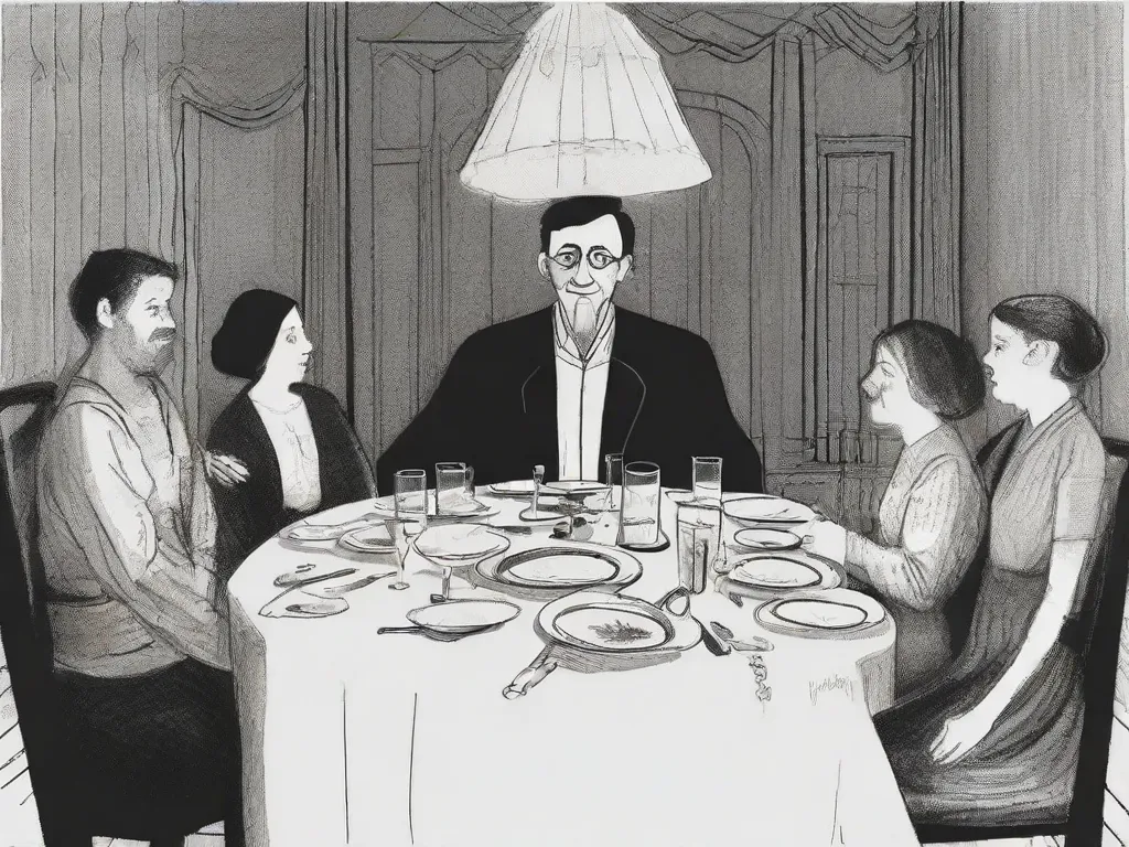 A father making Kiddush on Friday night at the Shabbos table with the Mother and Two sisters. The table is covered in dishes of foods and is set for 4 people with cutlery, plates and glasses of drink,