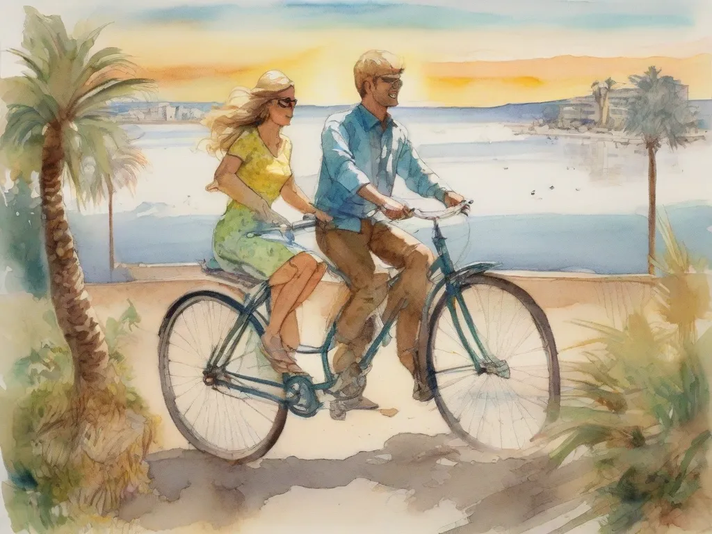 Vacación in Spain with sun and riding bikes at the seaside to puerto banus as a married couple (he is blond, she is brunette, both are 37 years old) being very happy and in love