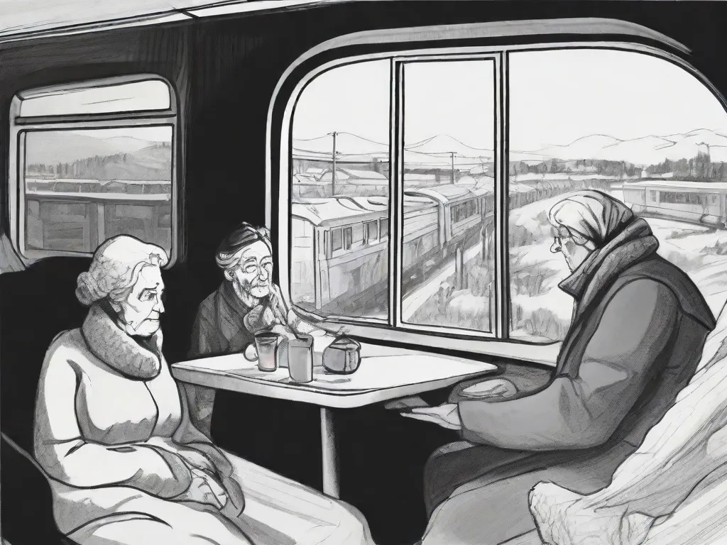 Long trip in the train in winter Russia, grandma and two grandkids drinking tea and looking out of the window into a snowy landscape