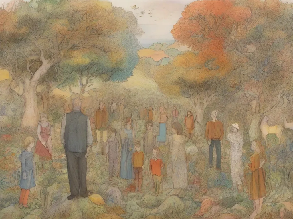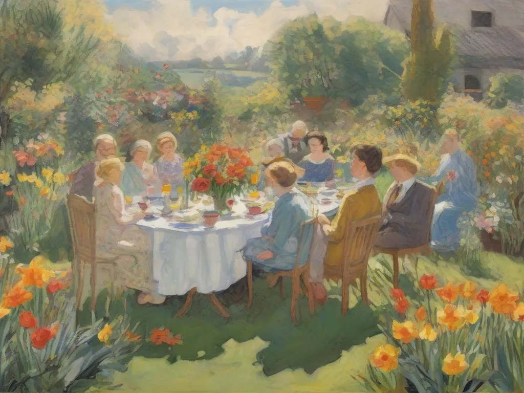A big family gathering in the garden of an English house with a mix of different chairs and one long table. Three generations eating together chatting. It is sunny and there are daffodils and other flowers in the garden.