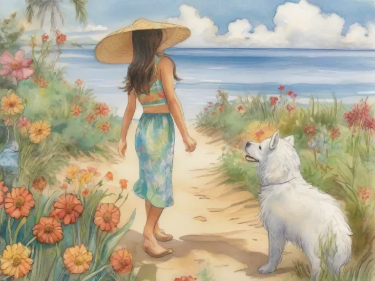 A girl was walking on a sunny beach with a cute wihte fluffy dog