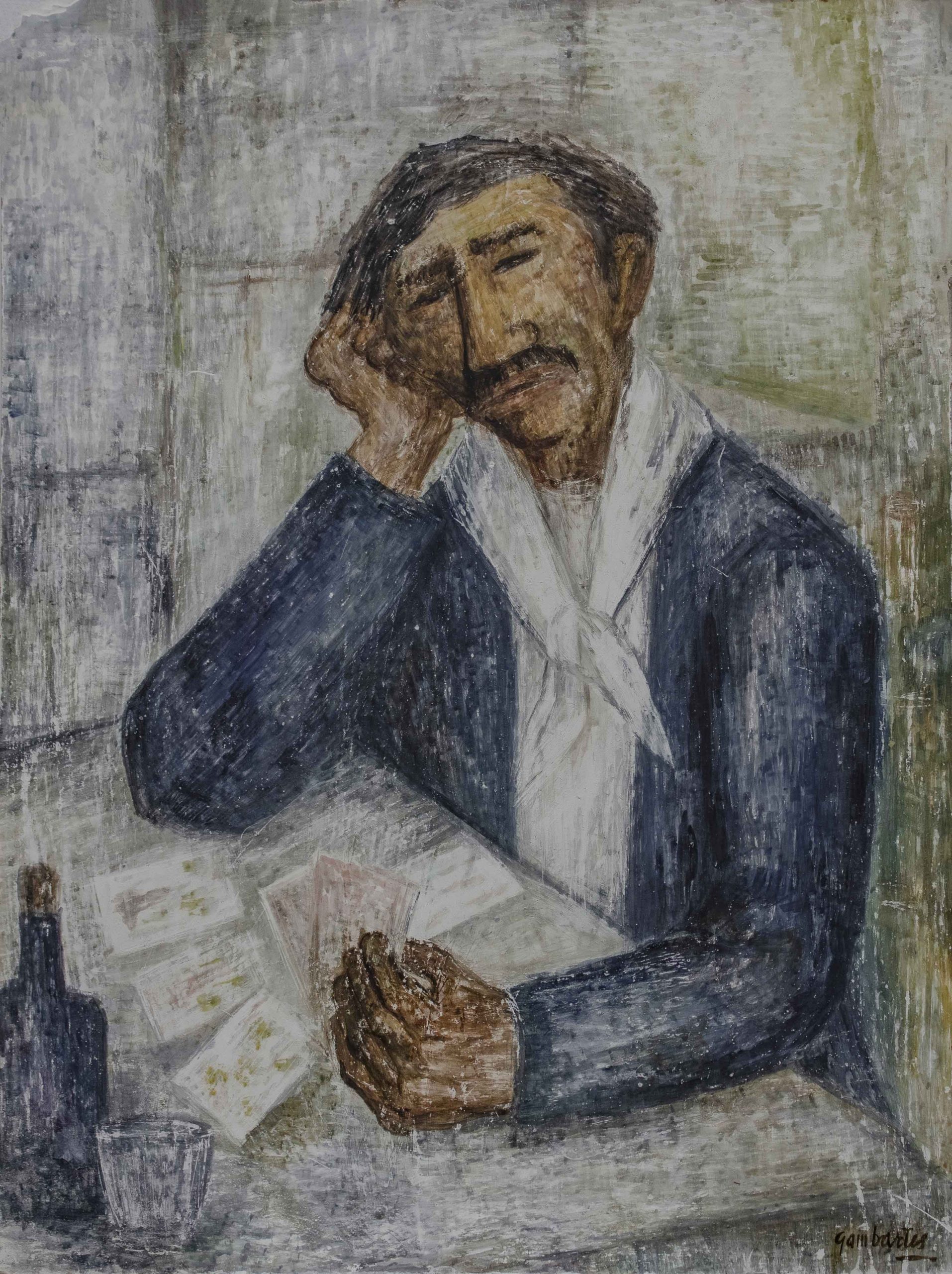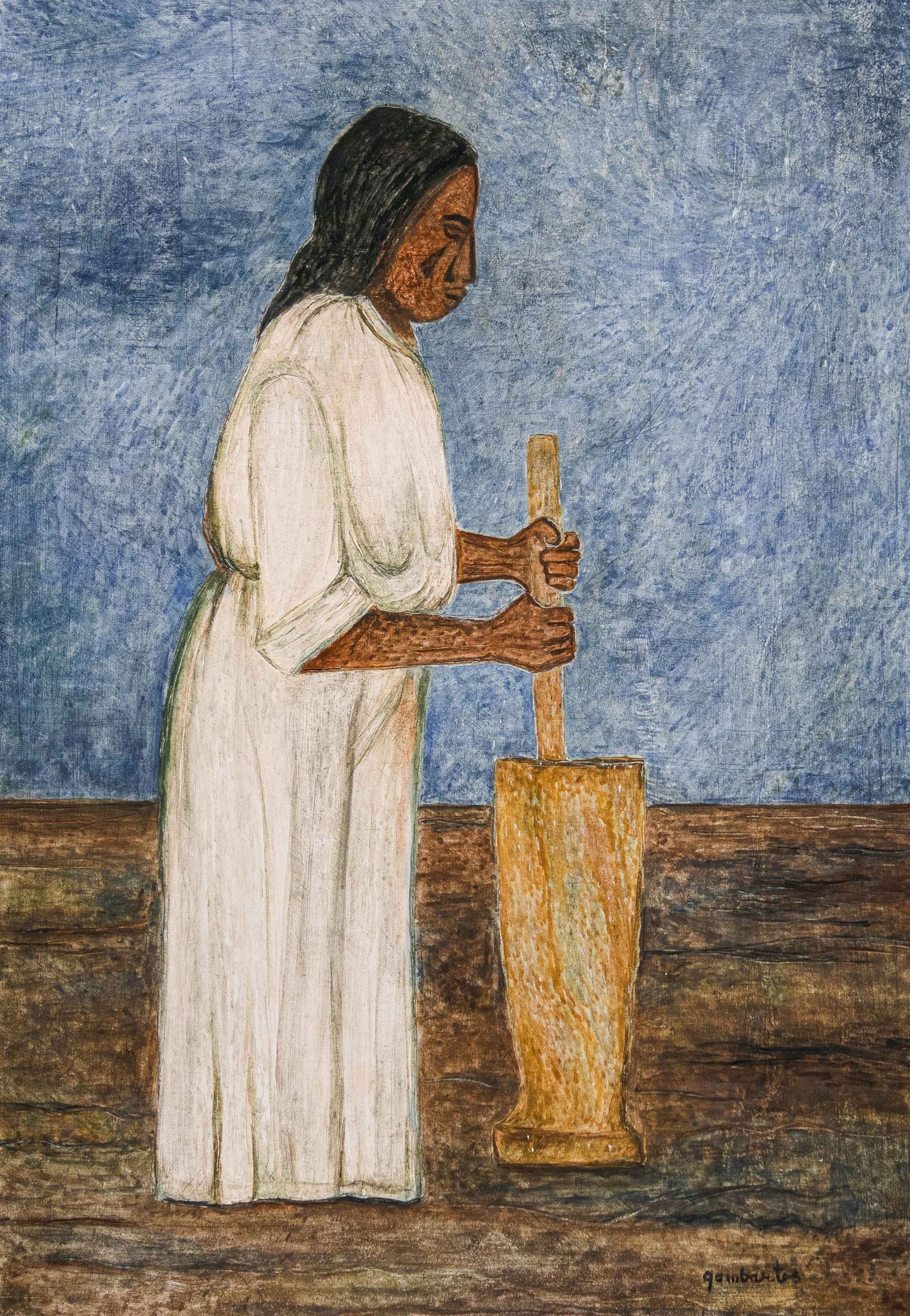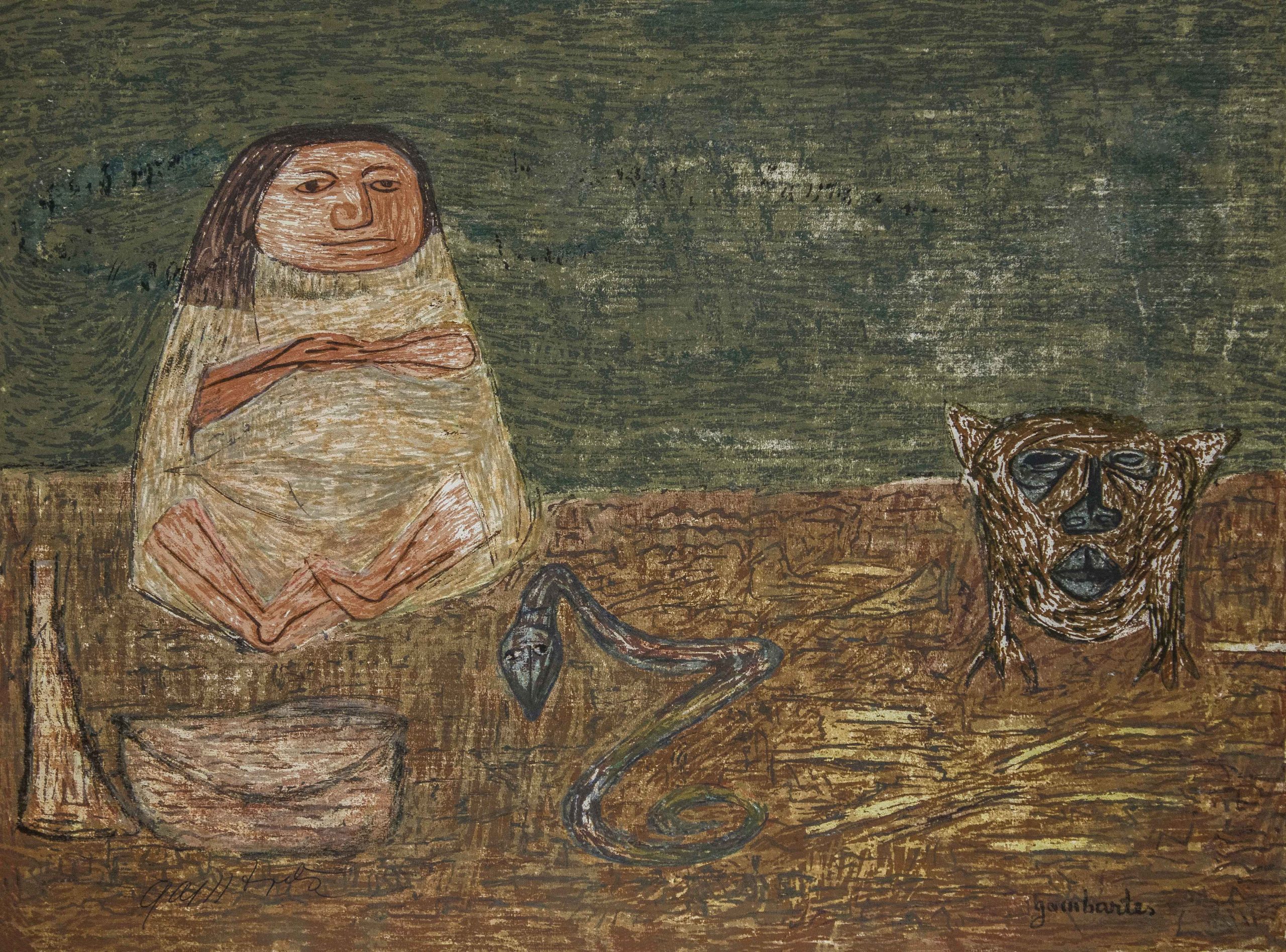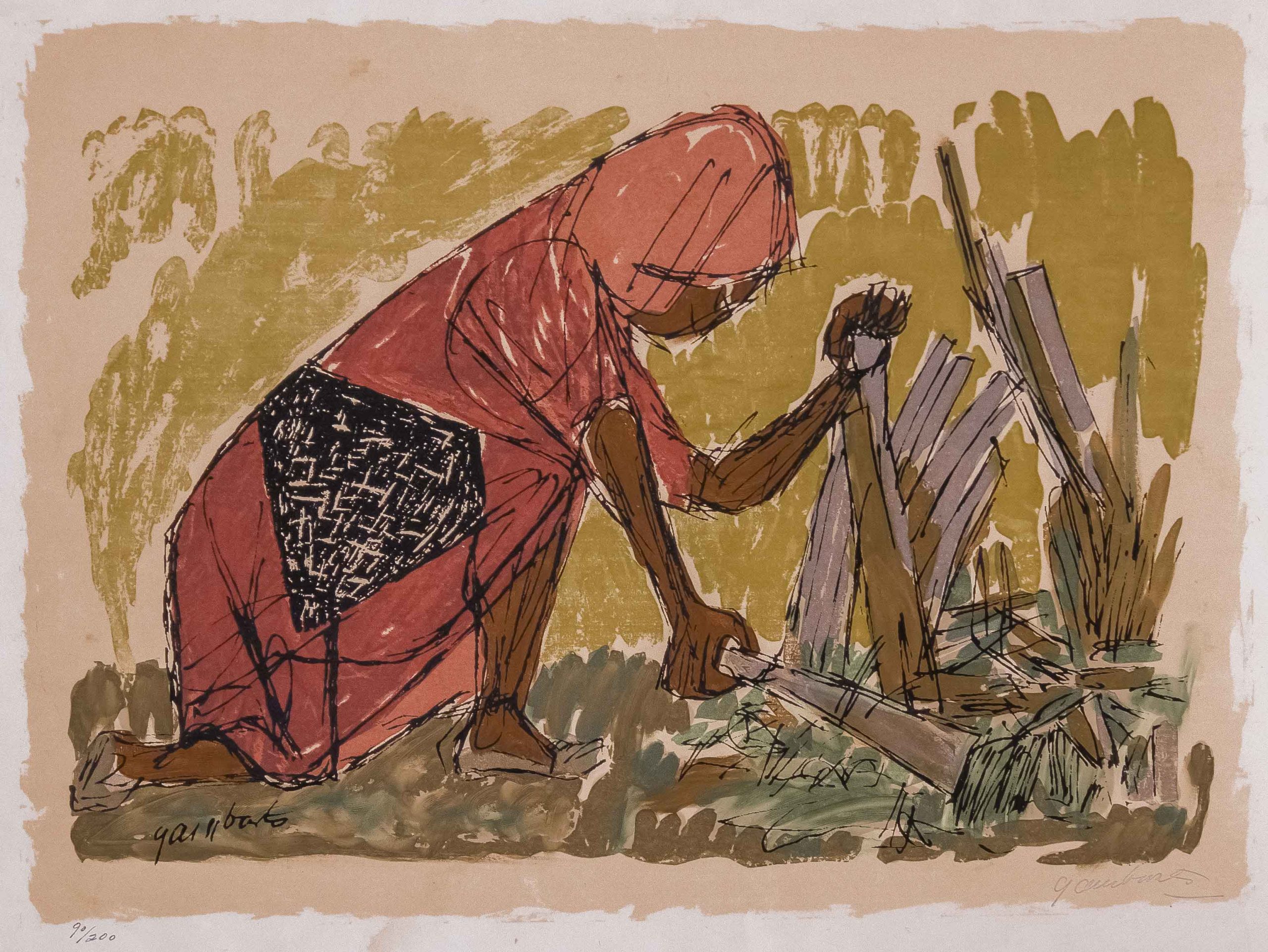 La producción de esta última etapa la podemos encontrar dividida según temática dentro dos series: Mito, magia y misterio y Figuras y paisajes, siendo a esta última serie a la cual pertenecen las obras aquí expuestas. En ellas vemos representadas escenas de la vida cotidiana de los habitantes de la periferia, principalmente mujeres autóctonas en actitudes de trabajo con la tierra, así como maternidades. Las figuras son representadas con carácter hierático, de pie, sentadas o en cuclillas, con un uso del color que puede oscilar entre lo sombrío y lo cálido. A pesar de lo mundano de las representaciones, Gambartes siempre incluía de manera sutil el mundo mágico que era propio de las comunidades representadas. De su última etapa cabe destacar también la experimentación plástica, matérica y de lenguaje, inventando la técnica pictórica cromo al yeso. Entre sus influencias directas encontramos a Antonio Berni, David Alfaro Siqueiros, el propio Joaquín Torres García o Paul Klee. Sus problemas de visión le condicionaron de por vida y serían también protagonistas en su obra. Incapaz de ver sin deformación una superficie superior a 30x40cm, en las obras que superan su campo de visión, el artista pintaba por fragmentos que se unían entre sí en una composición final que él mismo nunca sería capaz de contemplar en su totalidad.