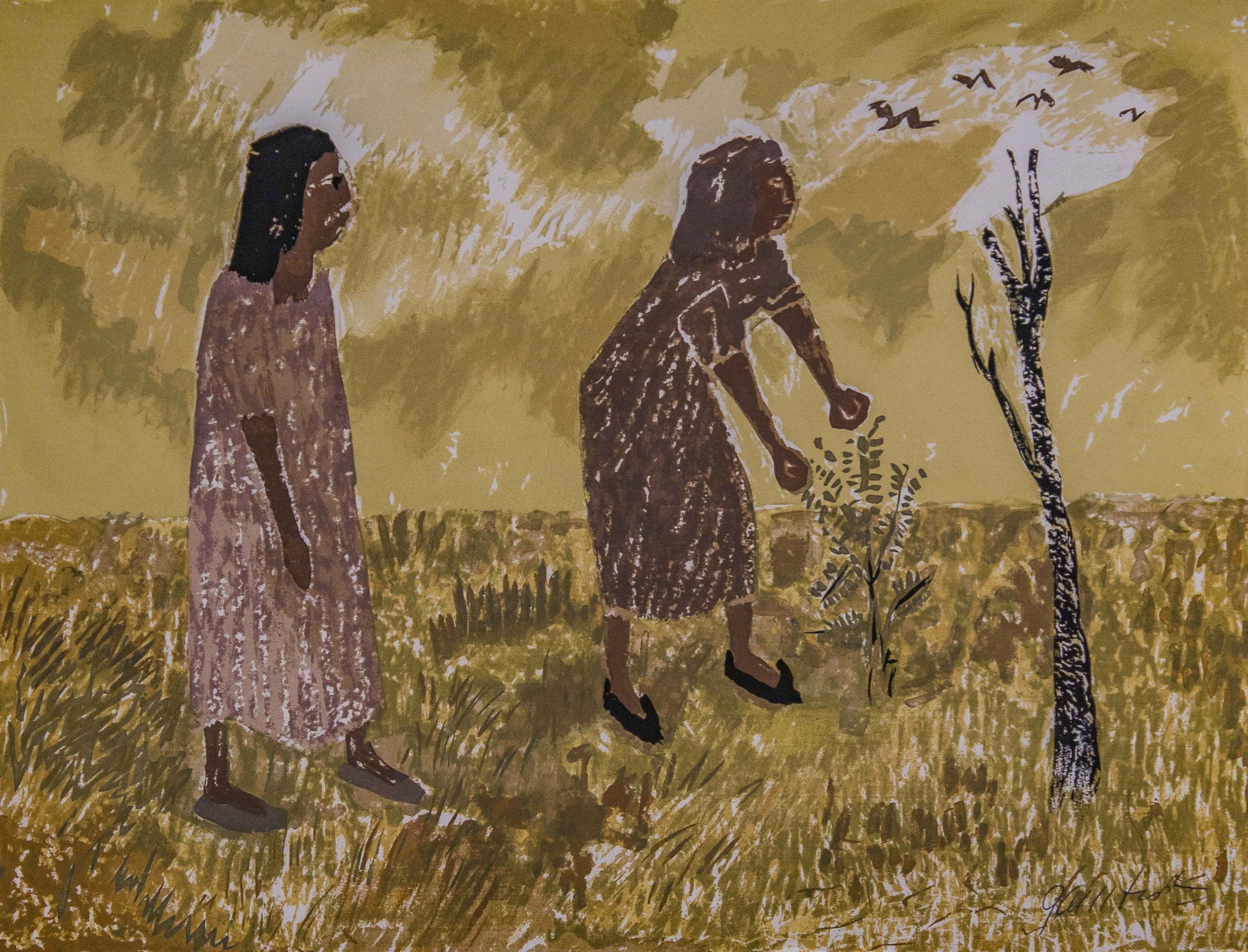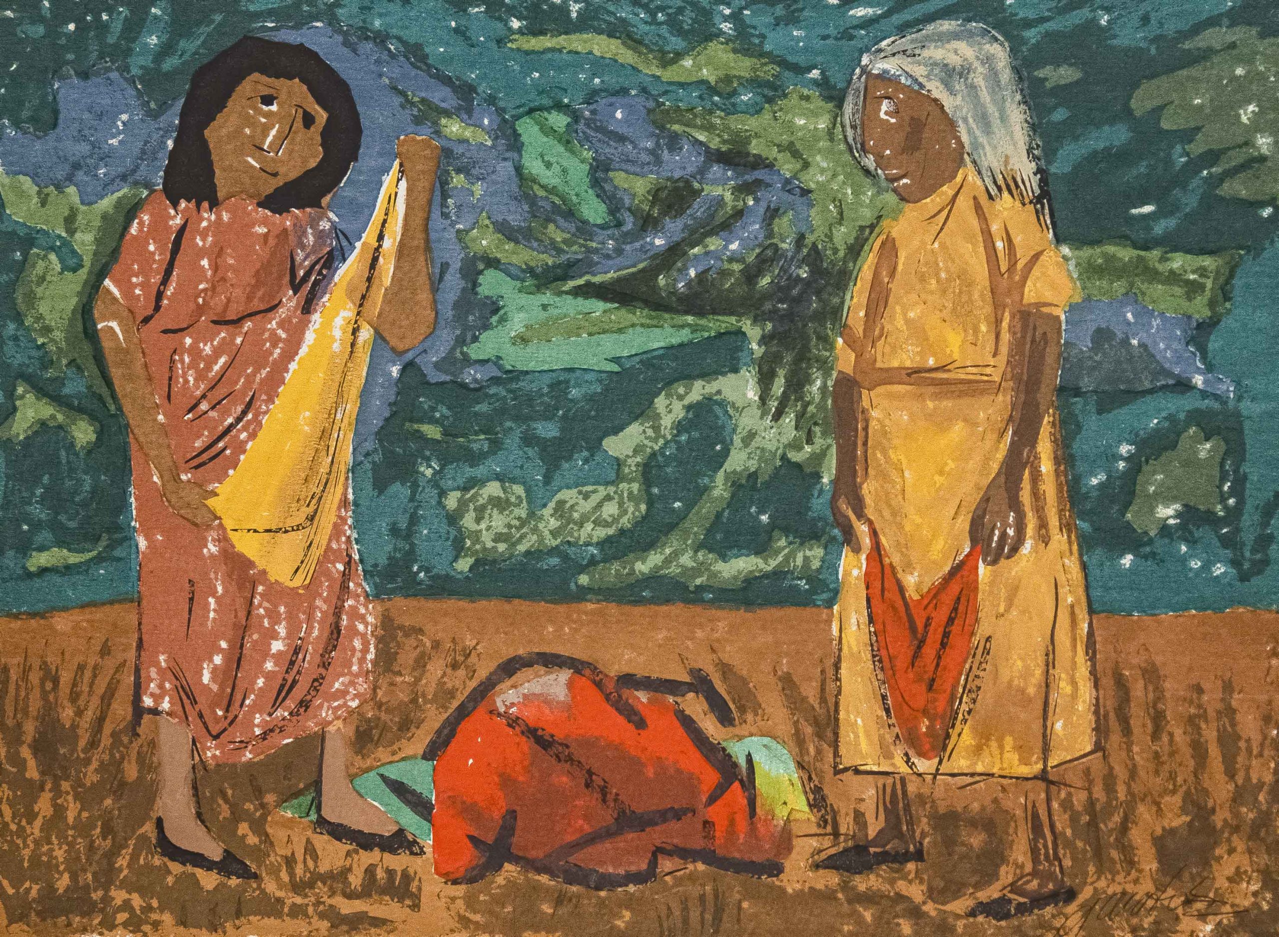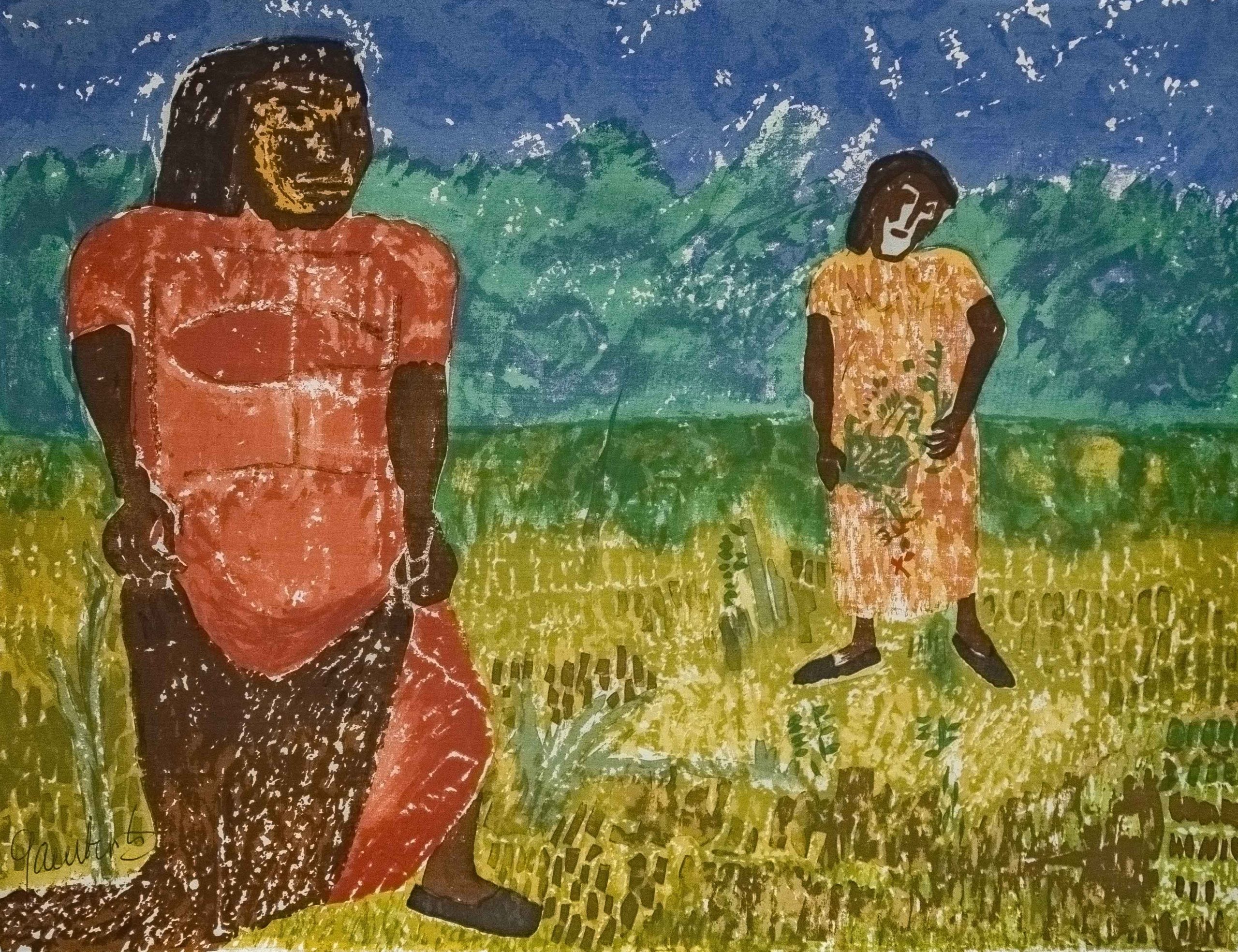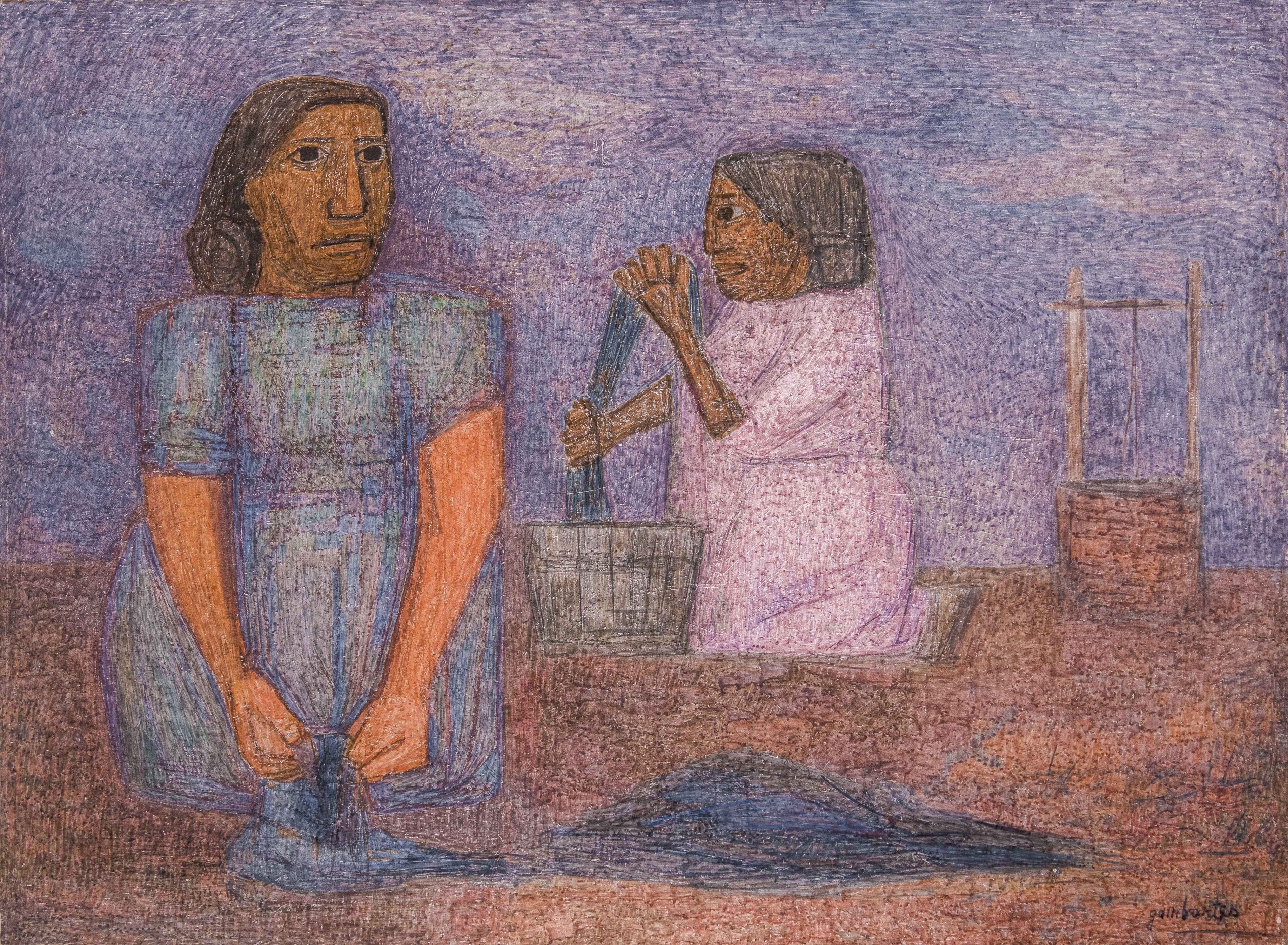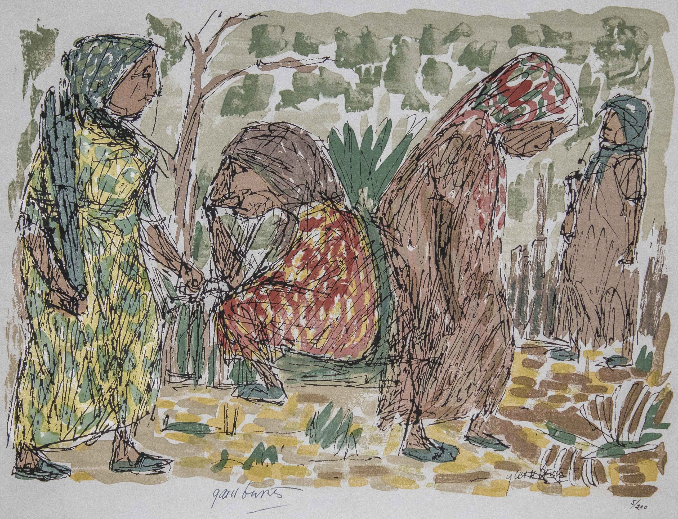 La producción de esta última etapa la podemos encontrar dividida según temática dentro dos series: Mito, magia y misterio y Figuras y paisajes, siendo a esta última serie a la cual pertenecen las obras aquí expuestas. En ellas vemos representadas escenas de la vida cotidiana de los habitantes de la periferia, principalmente mujeres autóctonas en actitudes de trabajo con la tierra, así como maternidades. Las figuras son representadas con carácter hierático, de pie, sentadas o en cuclillas, con un uso del color que puede oscilar entre lo sombrío y lo cálido. A pesar de lo mundano de las representaciones, Gambartes siempre incluía de manera sutil el mundo mágico que era propio de las comunidades representadas. De su última etapa cabe destacar también la experimentación plástica, matérica y de lenguaje, inventando la técnica pictórica cromo al yeso. Entre sus influencias directas encontramos a Antonio Berni, David Alfaro Siqueiros, el propio Joaquín Torres García o Paul Klee. Sus problemas de visión le condicionaron de por vida y serían también protagonistas en su obra. Incapaz de ver sin deformación una superficie superior a 30x40cm, en las obras que superan su campo de visión, el artista pintaba por fragmentos que se unían entre sí en una composición final que él mismo nunca sería capaz de contemplar en su totalidad.